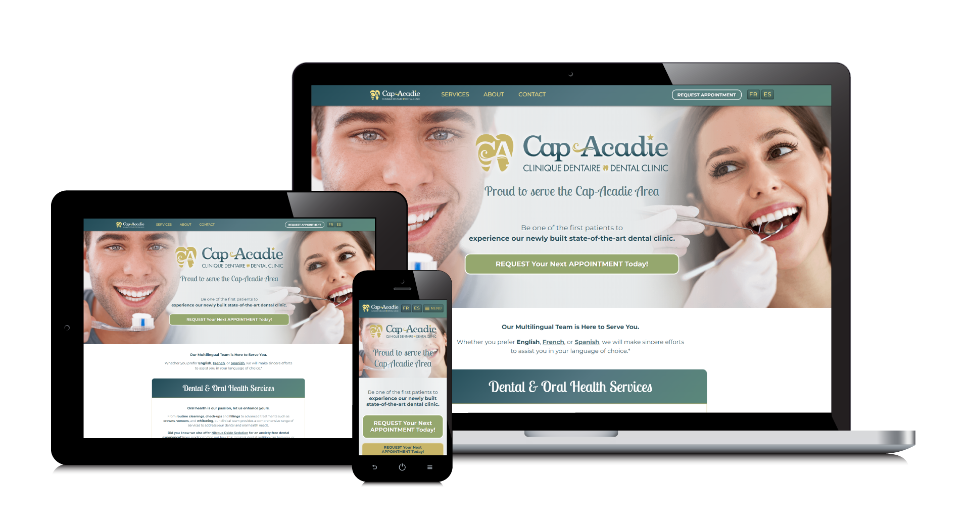 Designed for all devices, from desktop to mobile, the Cap-Acadie Dental Clinic website prioritizes accessibility and user experience. Patients can easily find the information they need and book appointments quickly. It also features one of our newly created logos, reflecting the cohesive brand identity.